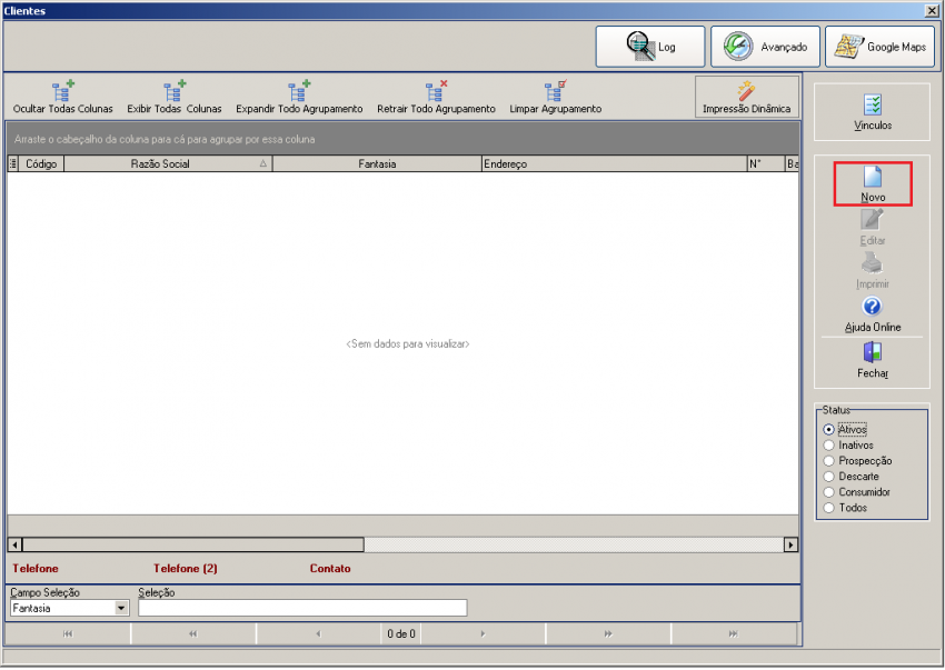 Clique no botão novo, o sistema abrirá direto na tela dados, preencha todos os campos azuis, abas Dados e Relacionamentos, com as informações solicitadas e clique em salvar.